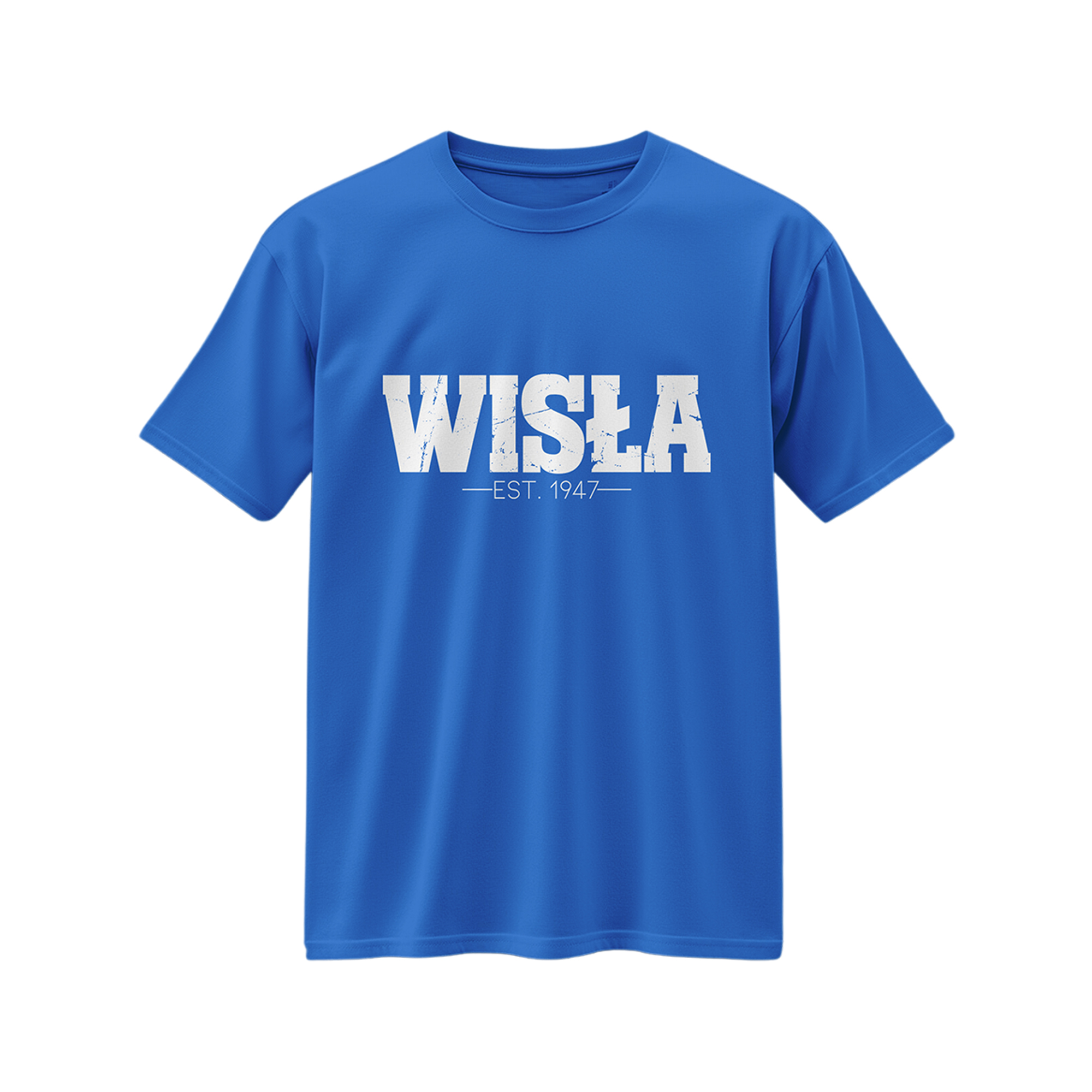 Niebieska koszulka z dużym białym napisem WISLA i dodatkowym tekstem EST. 1947.